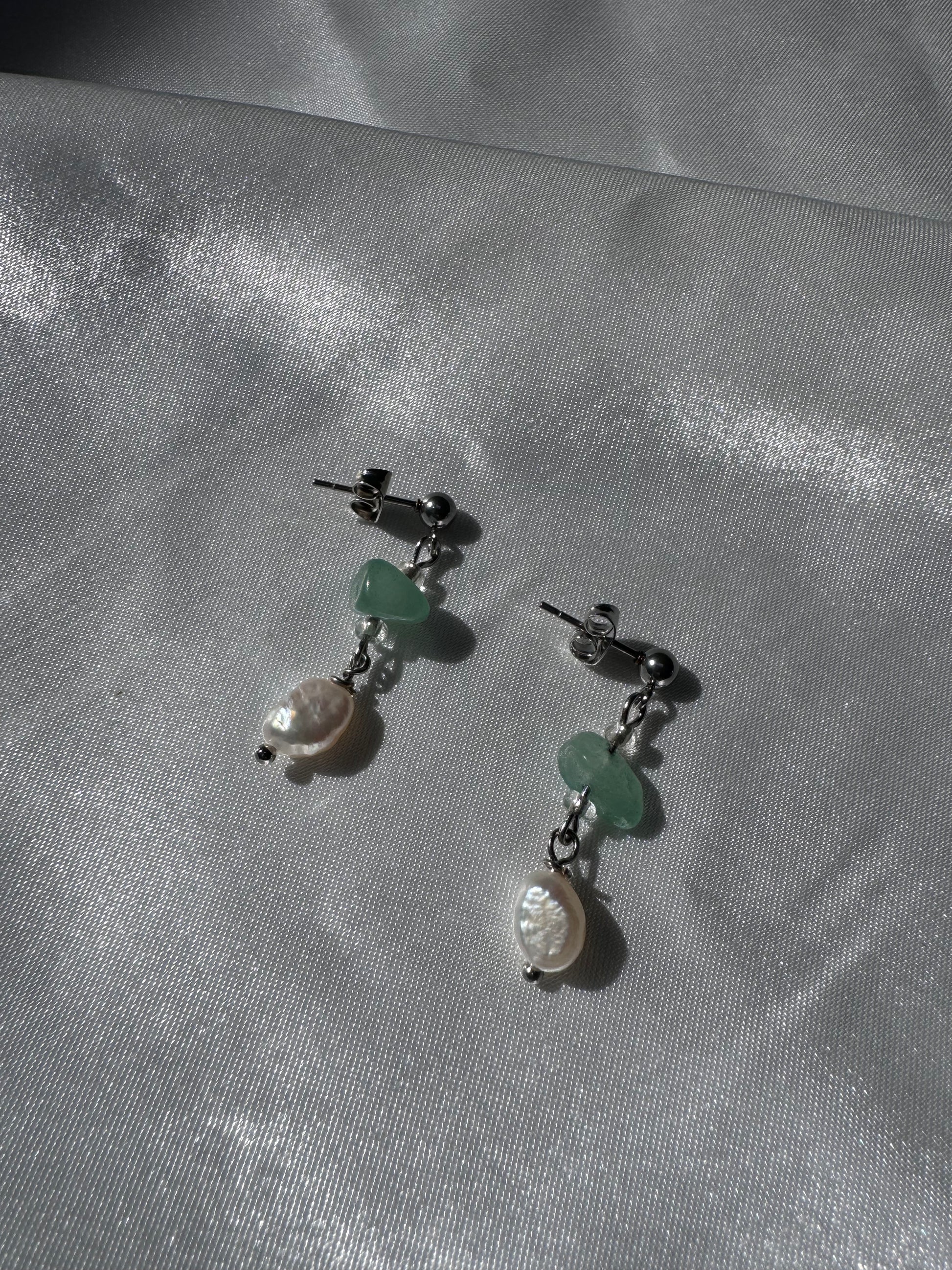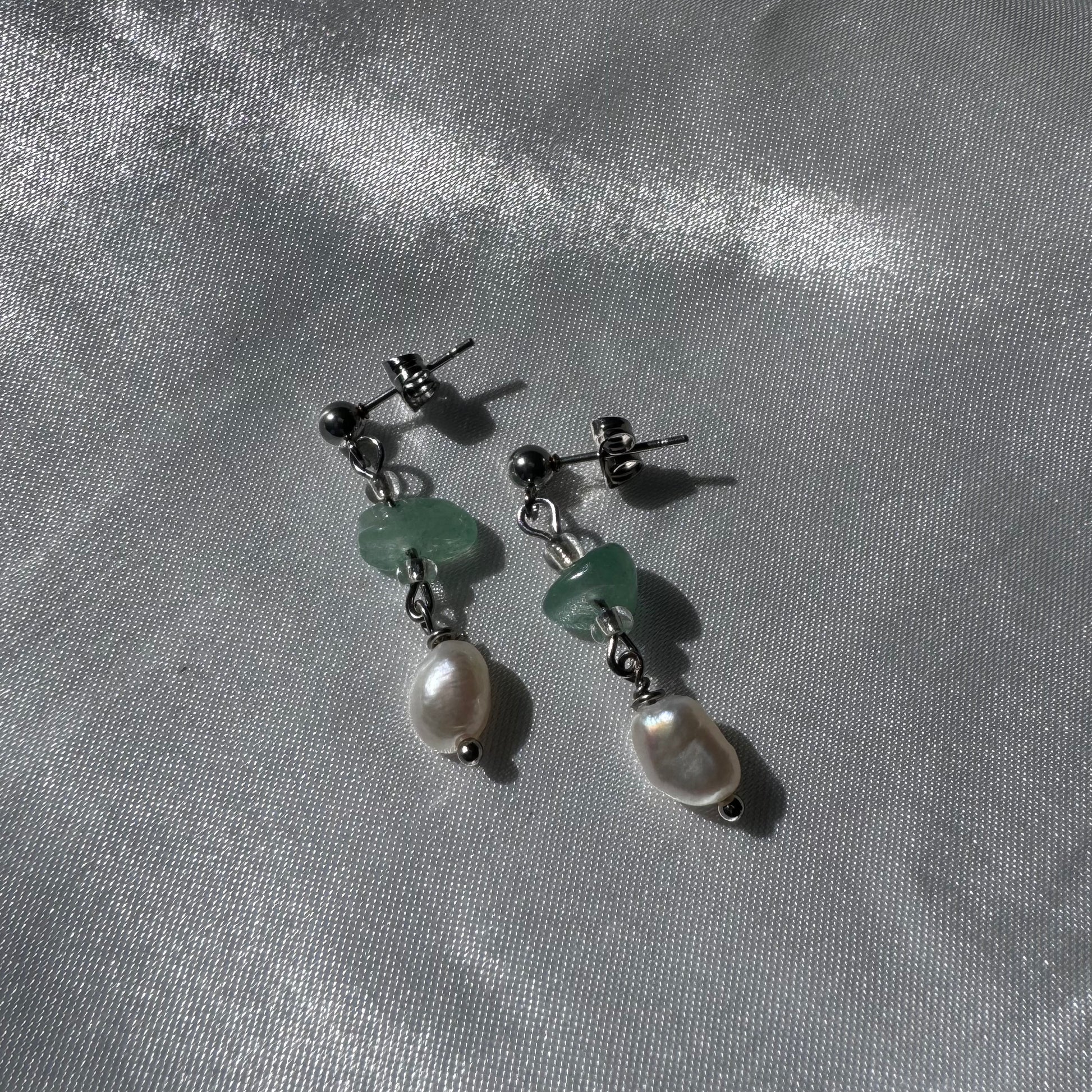 Håndlagde øredobber med jadesten og ferskvannsperler. Øredobbene har et vakkert og unikt design, og er helt nydelige for sommeren.